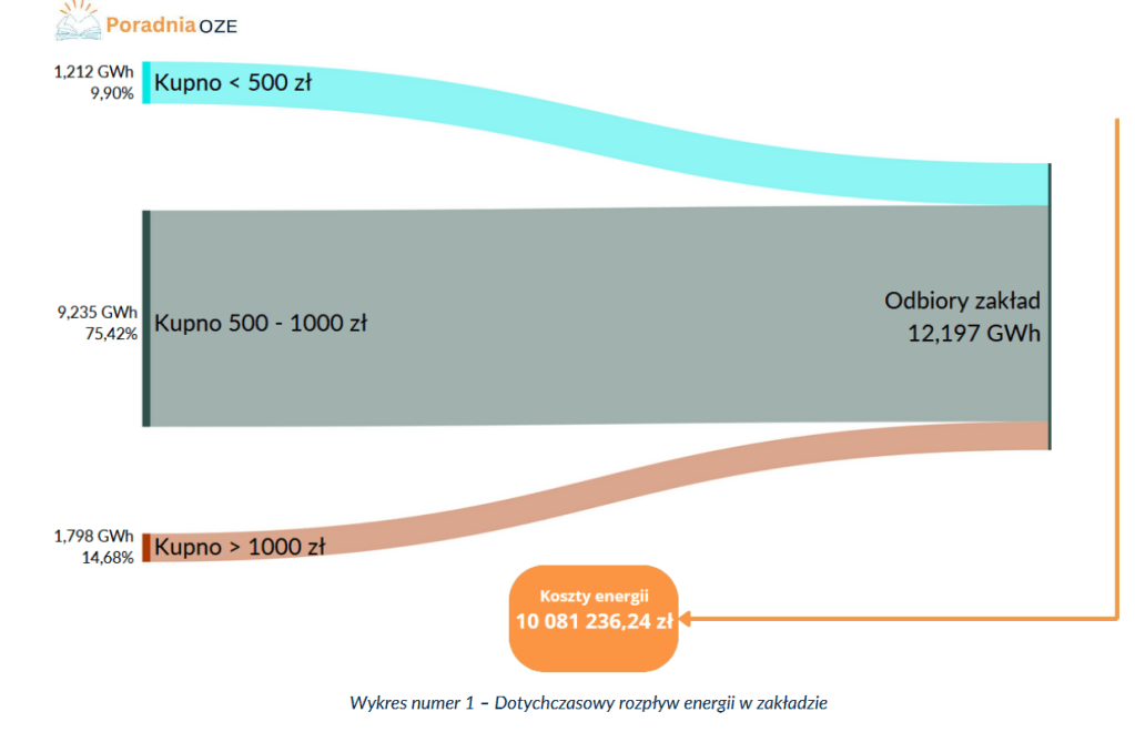 Roczny rozpływ energii w postaci wykresu Sankey z podziałem na kwoty zakupu energii w graficzny sposób przedstawia koszty energii przed i po inwestycją. Przykładowa analiza: