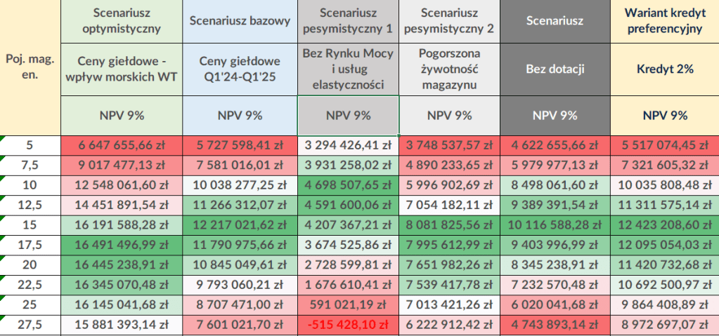 Ostateczny dobór pojemności magazynu energii odbywa się w oparciu o matrycę ryzyka i różne scenariusze. Poniżej znajduje się tabela, która wskazuje zwrot NPV inwestycji z 9% stopą dyskonta, dla różnych pojemności magazynu oraz różnych scenariuszy. Zalecana pojemność magazynu to taka, która jest korzystna zarówno w scenariuszach optymistycznych, jak i pesymistycznych.