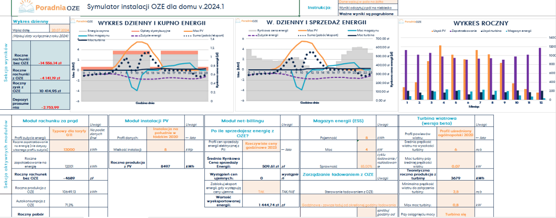 Artykuł omawia narzędzie „Symulator instalacji OZE dla domu", którego celem jest obliczanie zysków z instalacji fotowoltaicznej, magazynu energii i turbiny wiatrowej dla odbiorców energii. Program przeprowadza symulacje działania instalacji w skali roku z dokładnością godzinową. PobierzUstawienia ogólneKONFIGURACJA I WYNIKINajważniejsze wynikiWykresy dzienne i rocznyModuł zapotrzebowania na energięModuł rachunku za prądModuł fotowoltaikiSymulator za wysokiego napięcia w sieci … Czytaj dalej Symulator instalacji OZE dla domu – instrukcja obsługi