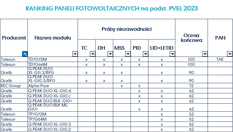 Ranking paneli fotowoltaicznych 2023 na podst. testów PVEL